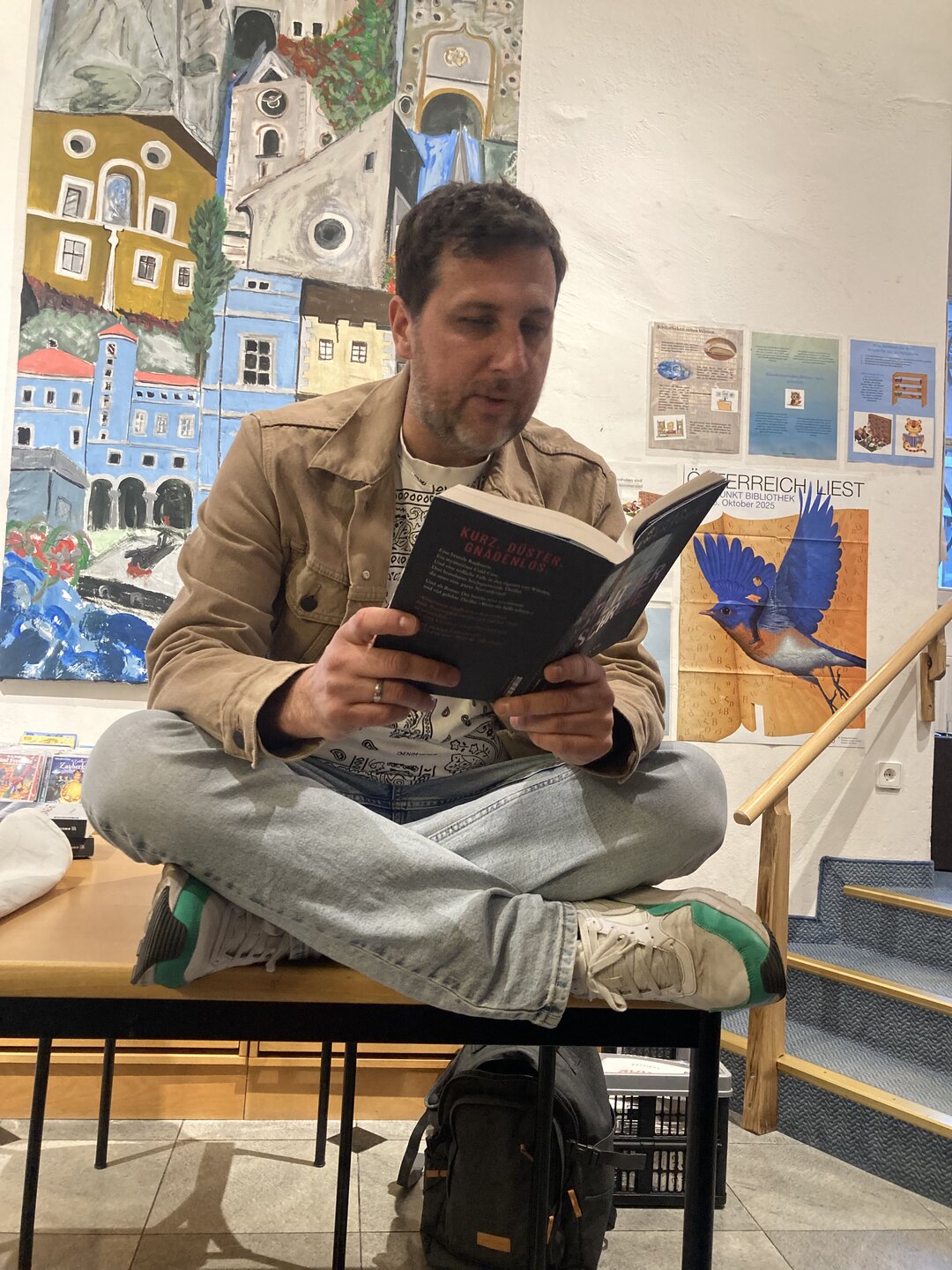 Am vergangenen Freitag, 24.4.,19 Uhr, las der Wiener Autor Roman Klementovic aus seinem neuesten Thriller „Dunkelnah“ in der Bibliothek Gmünd. Ganz unkonventionell auf dem Tisch sitzend trug der Autor vor und die ZuhörerInnen lauschten gespannt ausgewählten Textstellen. Verfilmt wurden bereits „Immerstill“ und „Wenn das Licht gefriert“ mit Adele Neuhauser, Erwin Steinhauer u.a. wird im Herbst/Winter ausgestrahlt. Man darf gespannt sein!